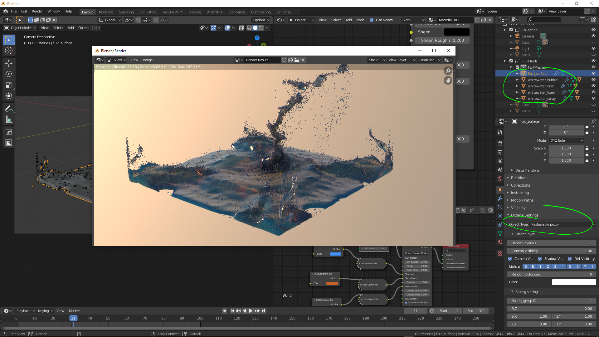 The only way I can get FlipFluid Whitewater elements to animate in final render is by globally setting Mesh Type in Octane Server setting to either Movable or Reshapable. Individual Mesh settings for foam, spray and bubble do not work. Mesh type for the main fluid surface works fine but Whitewater parts will not animate unless that global setting is used. NOTE that using a global setting of Movable will animate Whitewater but not the main fluid itself. So really the only setting to get a complete FlipFluid animation to render correctly is to use a Global Reshapable setting.