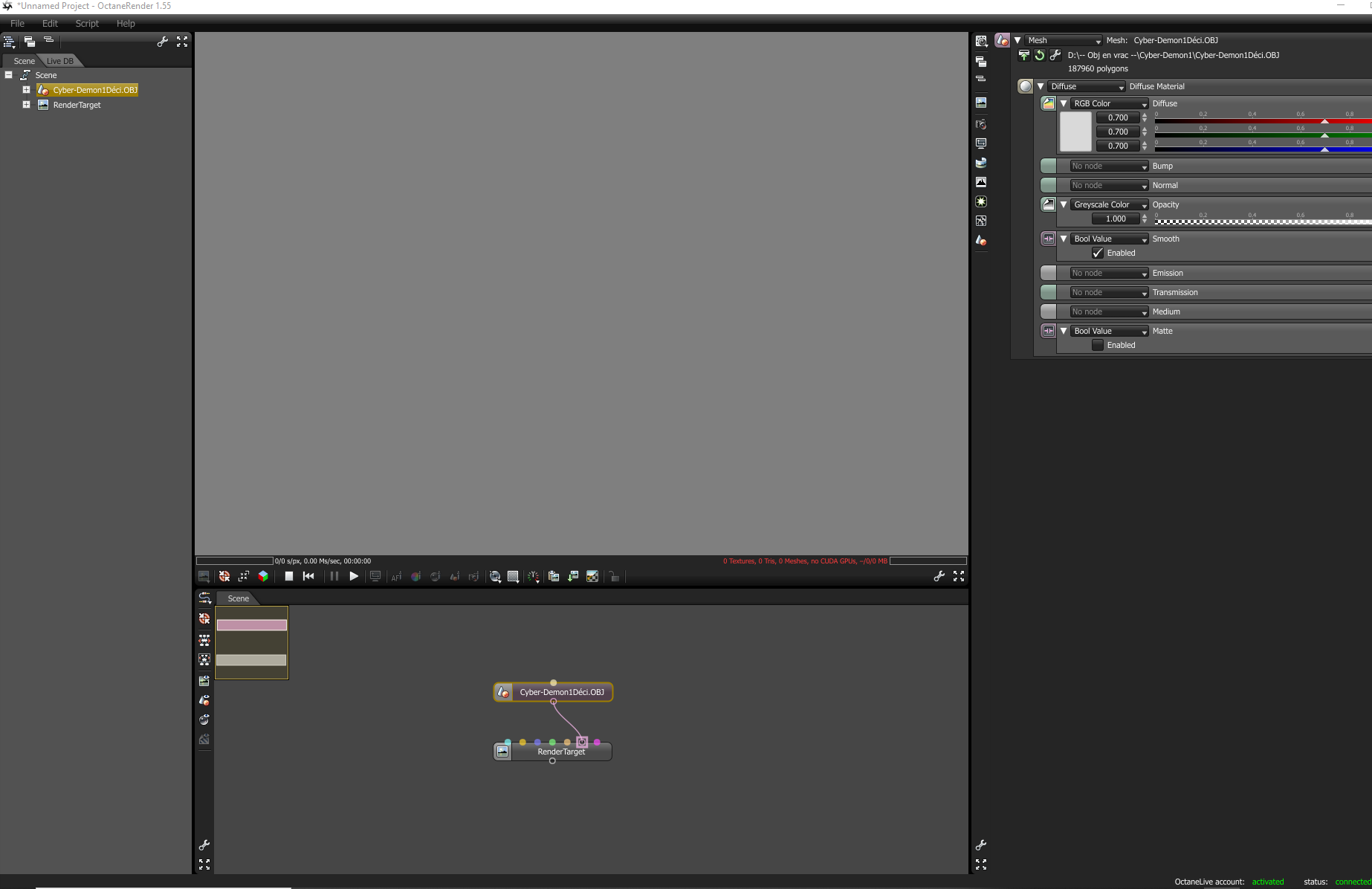 I just reinstalled my old Octane 1.55 "standalone", octane imports the mesh, it's ok, but there is nothing in the viewport. can someone help me understand the problem please?