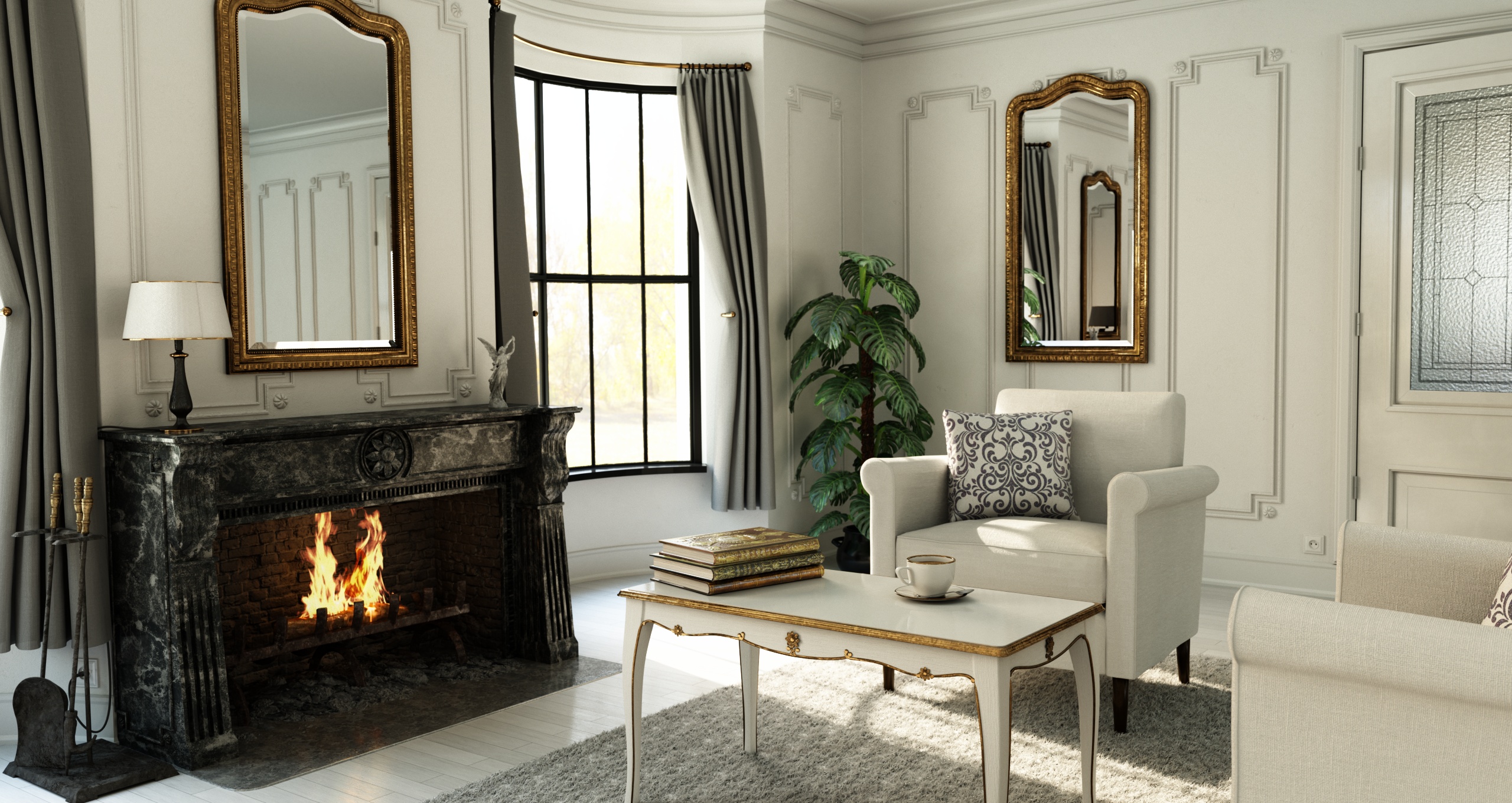I redid the pillow with a cloth sim to let it sit more naturally on the chair and I've changed the glass in the door. I will add some more finer detail to the pattern there too. I think I"m also gonna add a little picture frame on the fireplace and possible and coat hanger next to the door and then it's pretty close to completion
