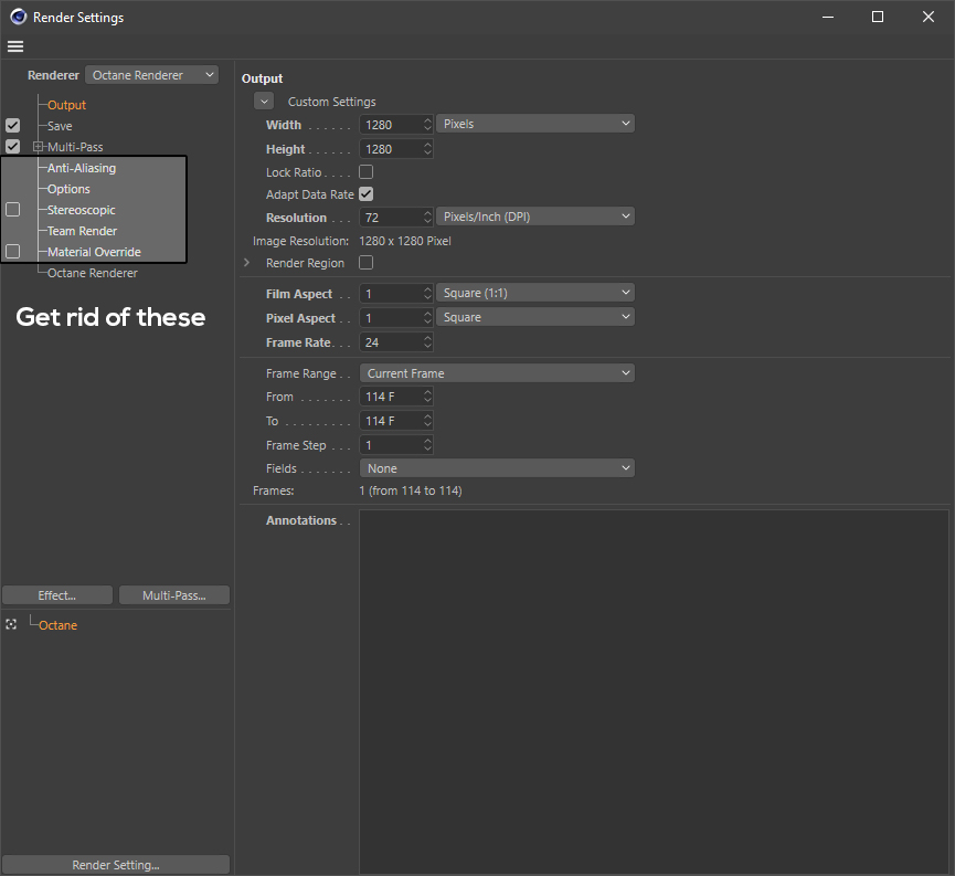 1.- Get rid of unnecessary settings relevant to C4D renderer in the Render Settings panel.