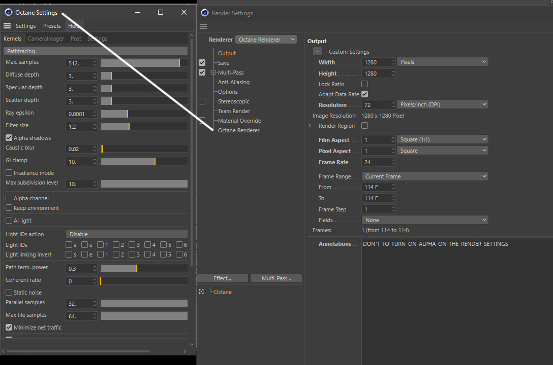 3.- Put the Octane Render settings in the Standard Render Setting of Cinema 4D.
