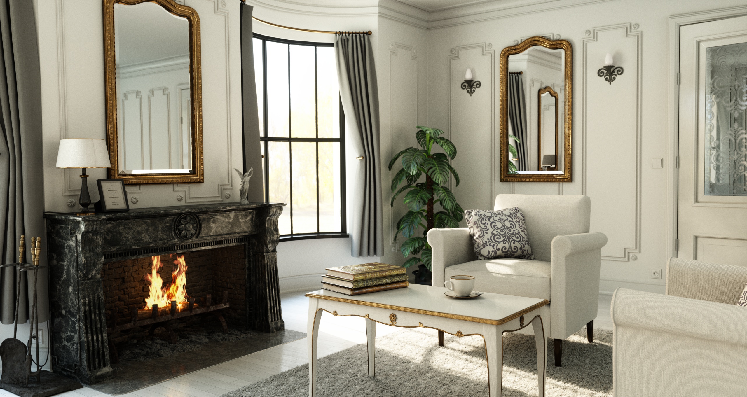 I redid the pillow with a cloth sim to let it sit more naturally on the chair and I've changed the glass in the door. I will add some more finer detail to the pattern there too. I think I"m also gonna add a little picture frame on the fireplace and possible and coat hanger next to the door and then it's pretty close to completion
