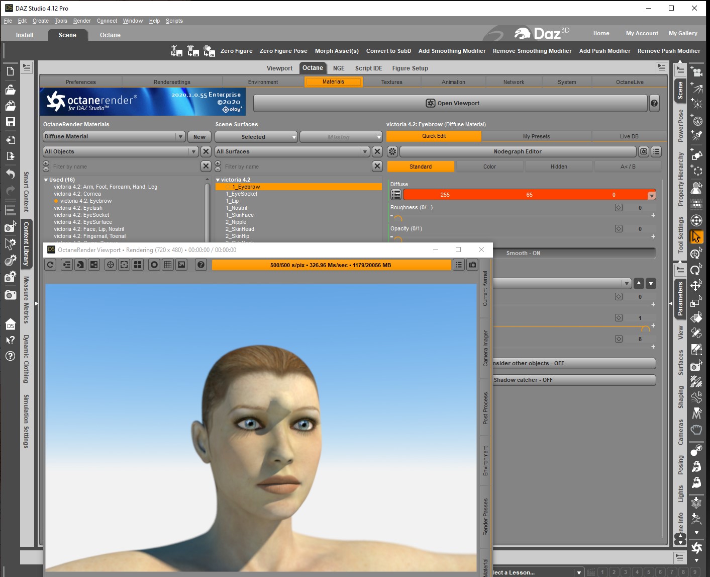 As a rule, with Octane, you do not want any intersecting surfaces, because if one of those surfaces has an Opacity which is not 1, there will be artifacts. In real life, you cannot have intersecting surfaces, so apply that rule to your Octane scenes. If think the Surface Material Filter is simply setting any materials specified in the list to have an Opacity of 0, so this is not going to get around your "eyebrows are going inside the head of the figure" problem. You need to move/morph them outside the surface of the head.