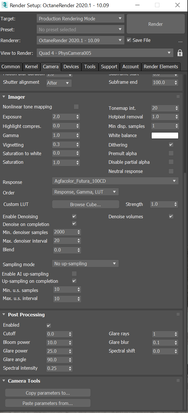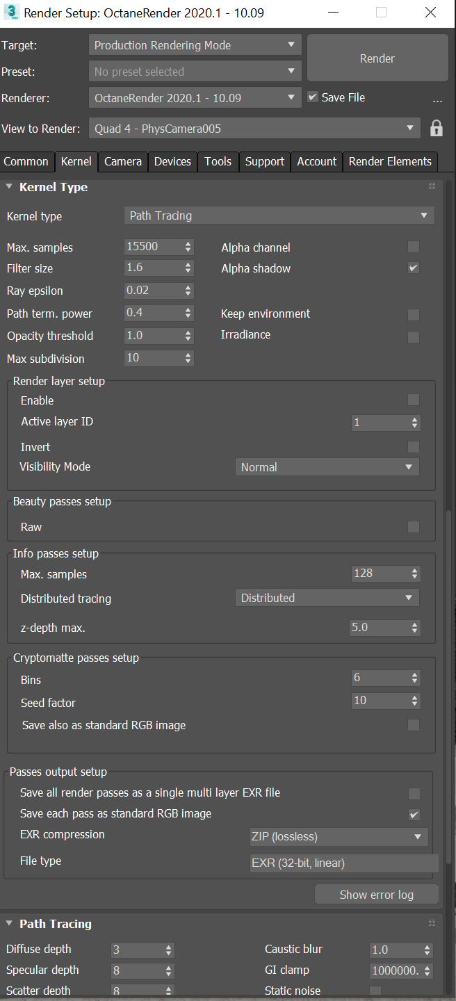 I’m having trouble with Octane Renderer for 3D Studio Max. I've searched all over the web and there are a lot of "my render is grainy" posts but nothing seem to work. No matter the values I give the Kernel or Camera, my renders are still coming out incredibly grainy. This is the result of a 30 minute render on an RTX 2080.