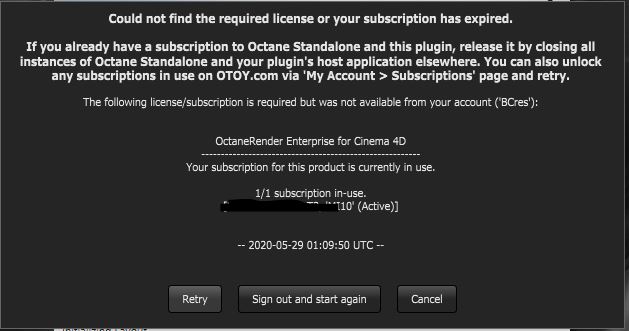 I've tried signing out of the standalone and back in but I keep getting met with this error on my way into C4D. Using the Account-Subscriptions option warns you so much about using it, I have decided to ask how to fix this here first.