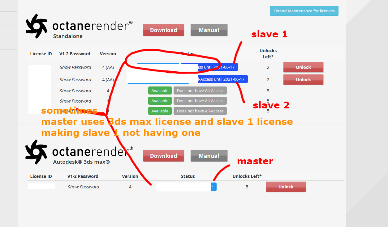 we have two slaves using all access licenses and we have 1 master that uses 1 3ds max license. As far as I understood 1 all access covers one master one slave.