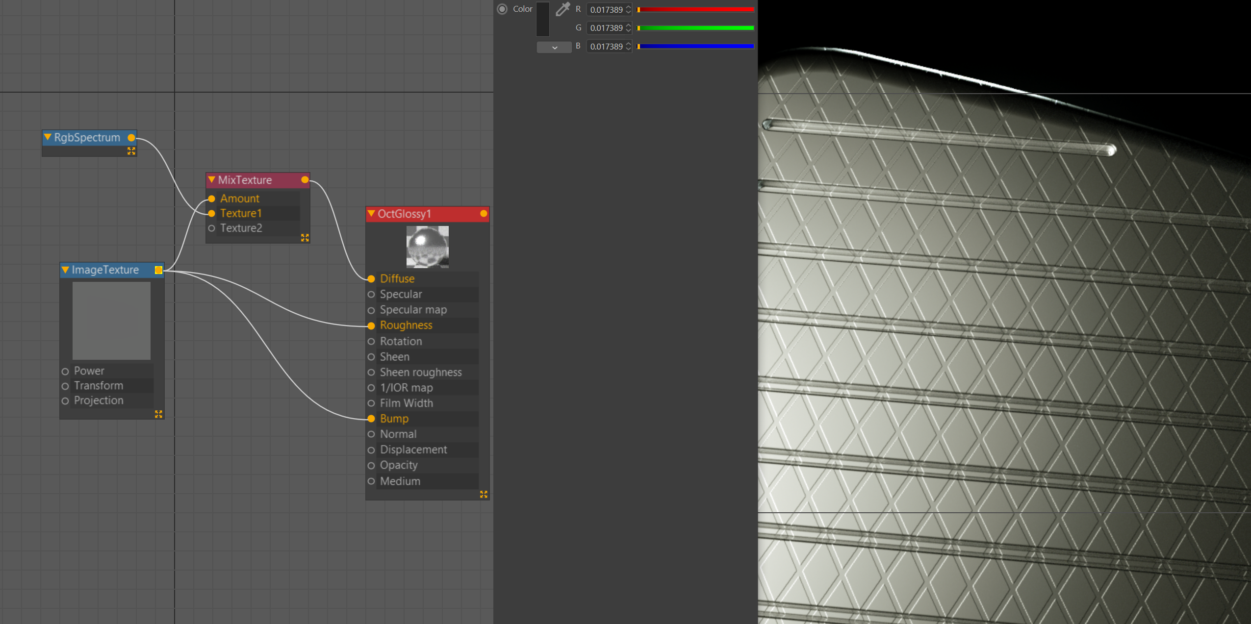 I've got an interesting problem and I'm certain there is an Octane solution. The image attached is a metal material with some roughness and a diamond hatch pattern created by using a 4k bump map. Nothing crazy going on with the material. This effect is perfect looking. But the actual real life product has a paint fill inside the lines created by the diamond pattern.