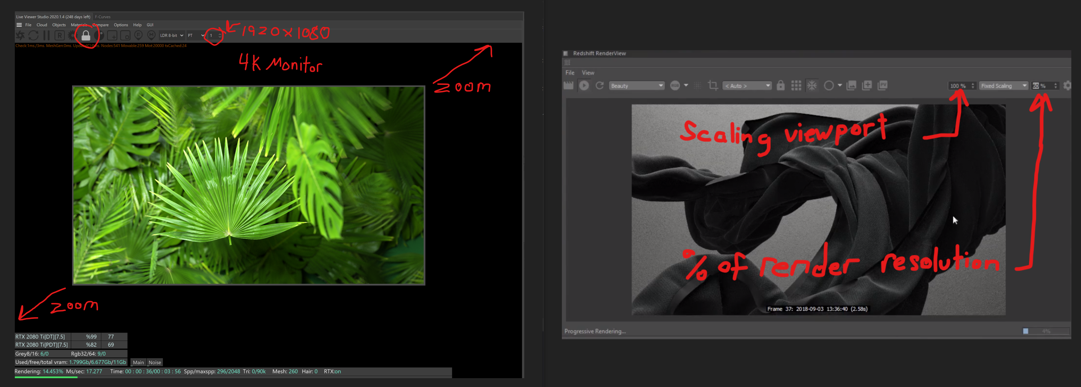 Hi Aoktar (take the weekend off!), yes that looks like that's what we're asking for. Hard to tell since I don't see you adjusting the scaling via a drop down or entering a number. I've attached an image where when I lock the resolution at "1" for a 1920x1080 project in a window on my 4k monitor it's small. To get Octane to fill the space I set the lock at "1.4" but I'm loosing some speed since I'm rendering more pixels than I will on the final image.