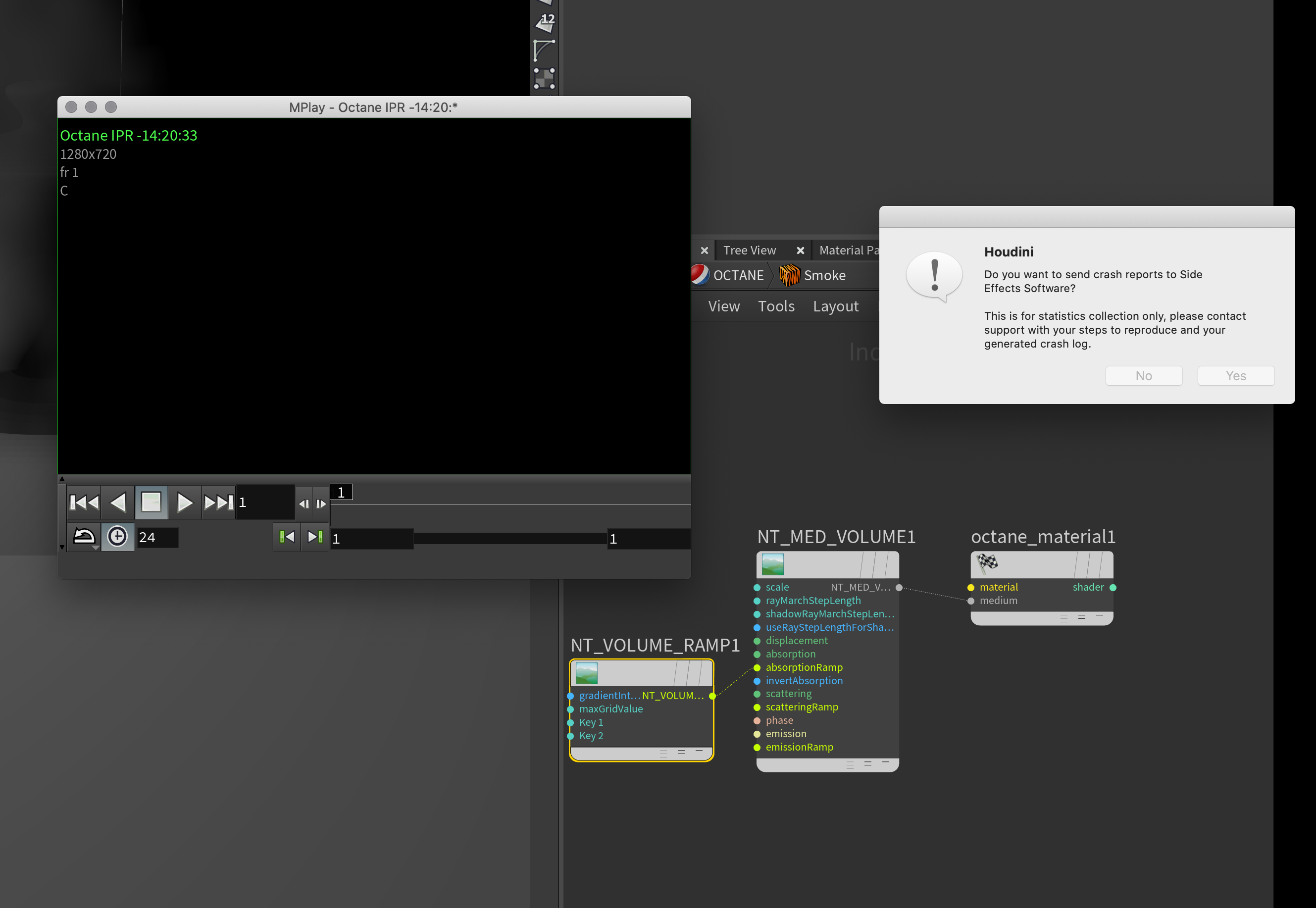 Hi, just got a license to try out Octane in Houdini on Metal and there seams to be an issue with the volume ramps. The volume material renders in the IPR but as soon as I add a ramp to absorption it crashes. Tried it a bunch of times with the same result.