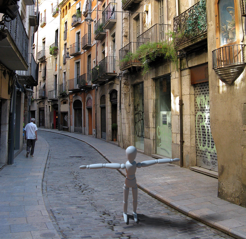 I used a background object to load an image of the street as a texture, then put a figure in and a plane. I copied the background texture object to the plane and set to frontal projection. Then I added a compositing tag and set the compositing background property.