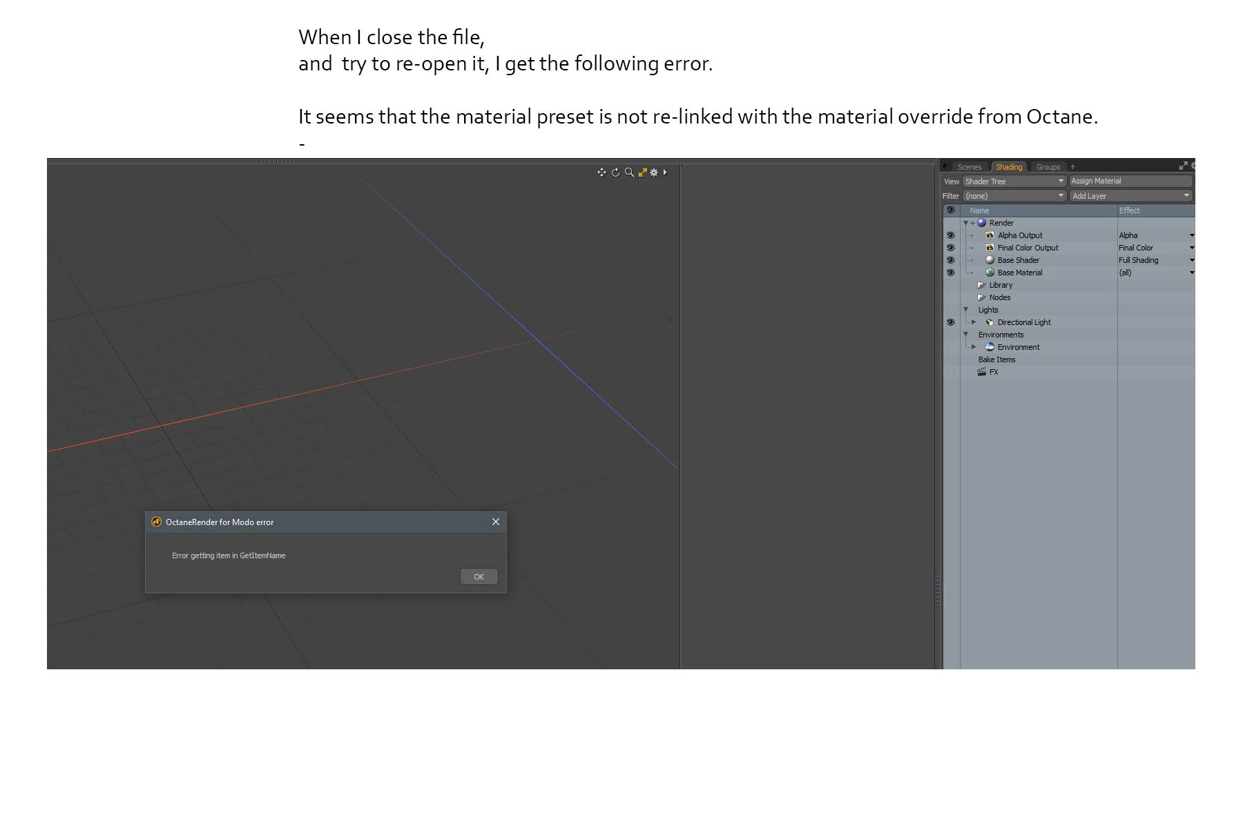 Addendum to the above. I have fixed the crash when loading .lxo files with Material Presets assigned to an Octane Override preset. Any Octane Override preset is /not/ loaded into the plugin. I would need a copy of the presets you are trying to load in order to see if loading those presets can be supported.