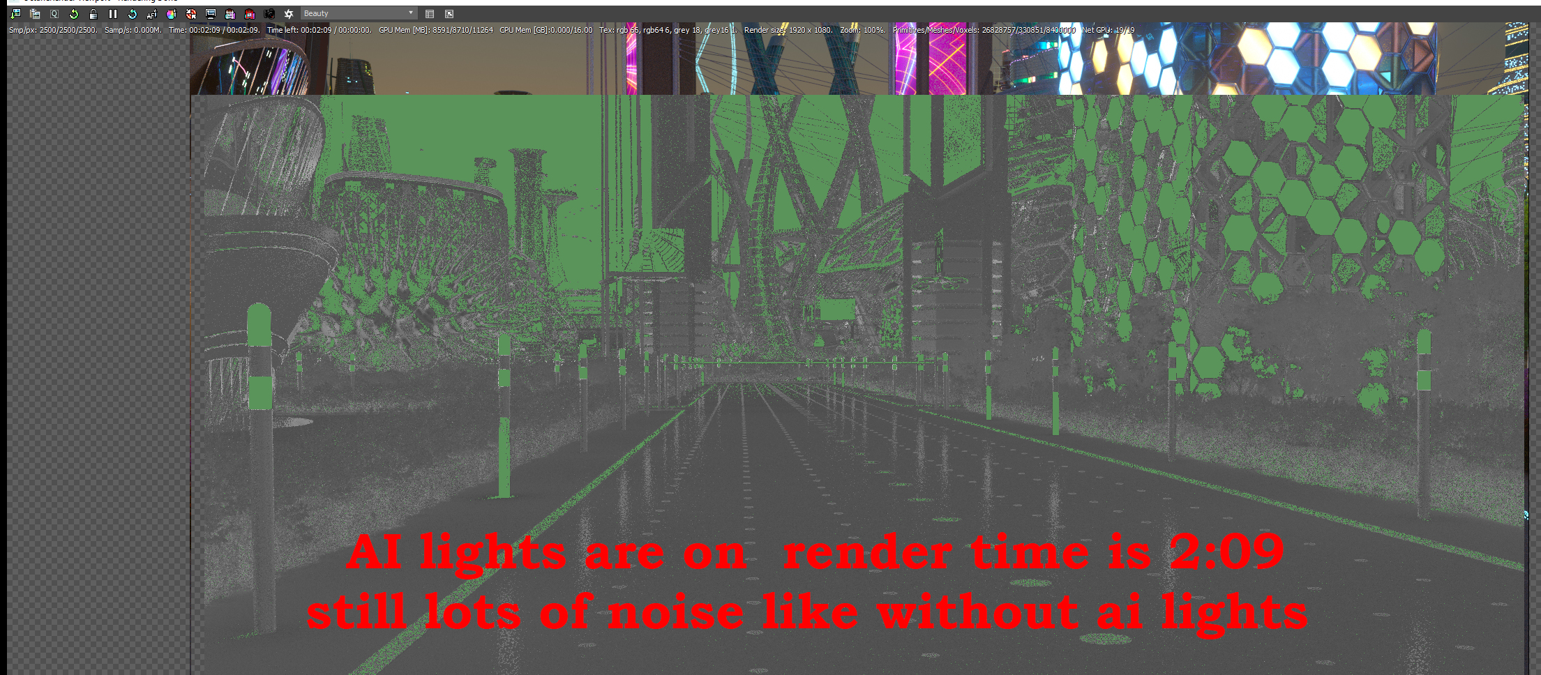 1. For some reason AI lights make rendering slow (3 times slower) and with about the same amount of noise. Will this be ever fixed? It is about 150 Sampl/s with AI light OFF vs just 50 Samples/S with AI on