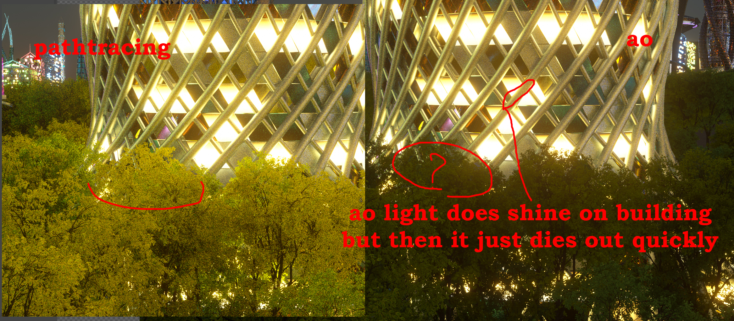 unfortunately rendering animation with pathtracing in the city full of lights is still impossible. Please look into AO , please add a cheat where ao light can shine better on objects. I think it is an old bug or that's how AO was coded.