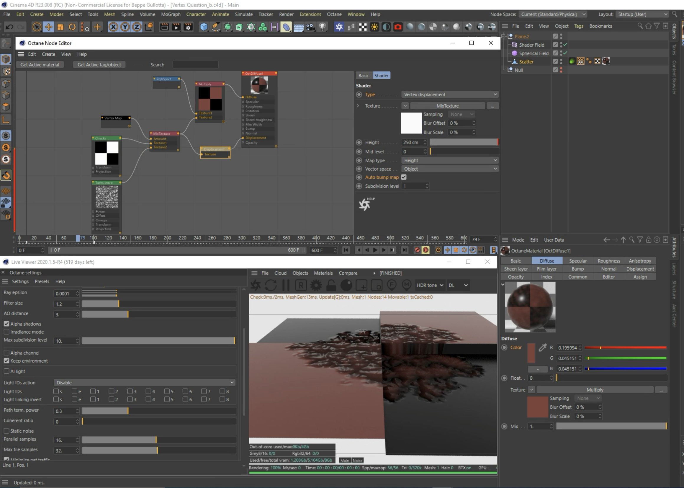 (I am using 2x 8k disp maps into the baking node but they are not included for size reasons which is why I have a checker and a turbulence going into the baking node)