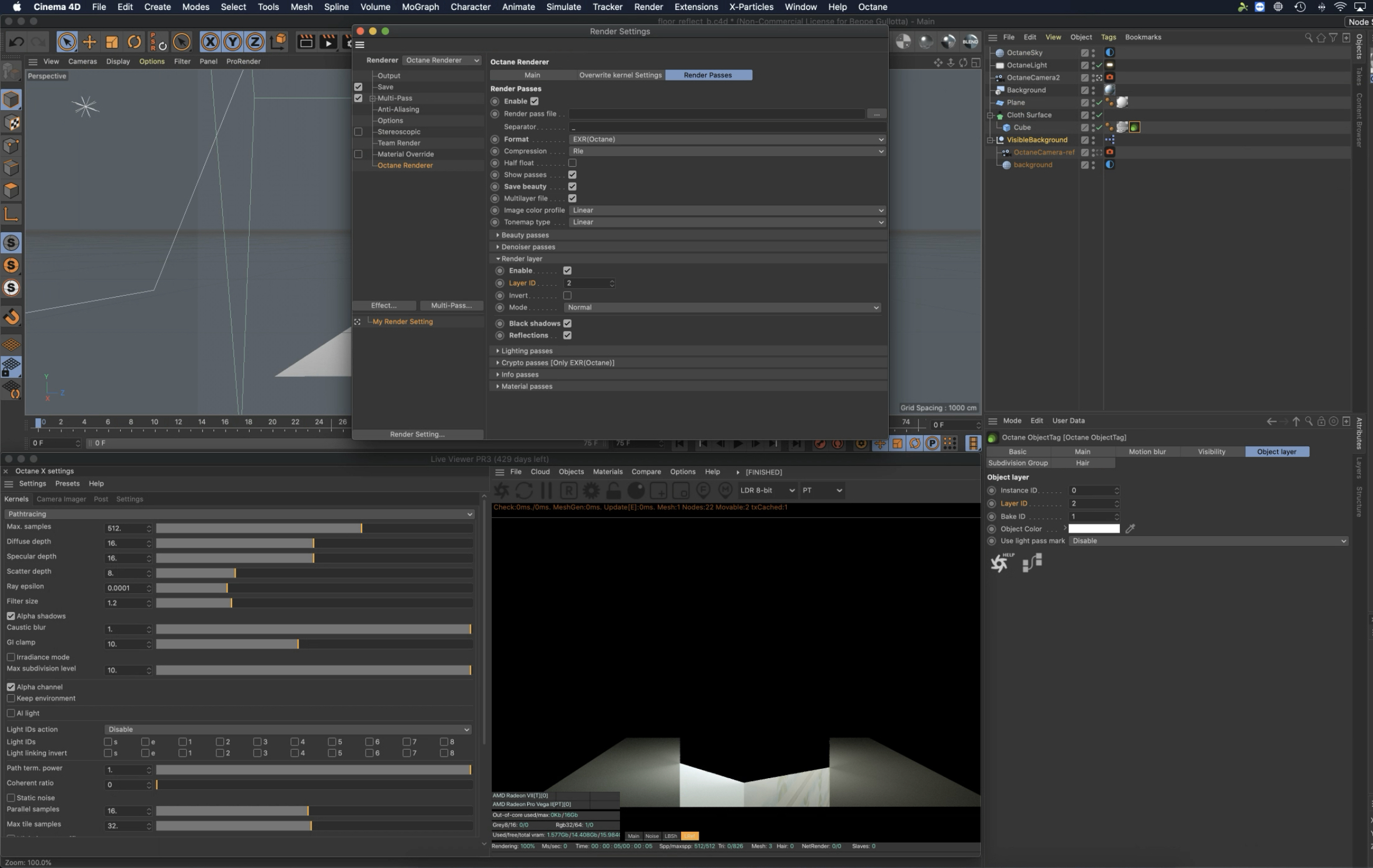 1) In order to extract the Shadows of the cube on the plane you have "enable" passes, I've placed an octanetag on the object that I want to extract shadows giving an appropriate Layer ID.