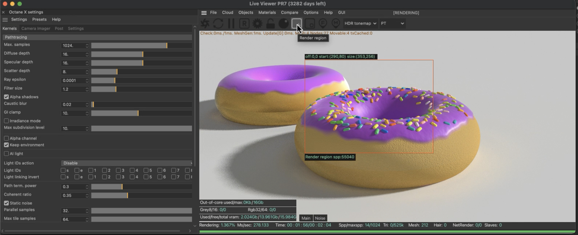 I've also noticed that when I enable a render region of any size the samples stop at 60 no matter what my target samples are. In CUDA it'll keep going even past the "Spp" I set in Octane Settings (Which isn't perfect but better than caping at 60).