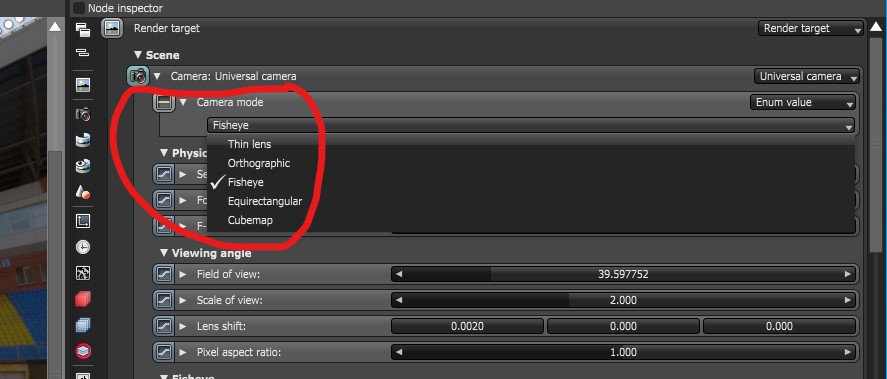 On camera after selecting "Used as Universal Camera" how do I get Octane Blender to use a Fish Eye camera? In Stand Alone there is a further camera mode where you can select various types (Fish Eye, Equirectangular, etc..). I don't see that in Octane Blender - the Universal camera defaults to Thin Lens and I can't see how to activate the other modes.