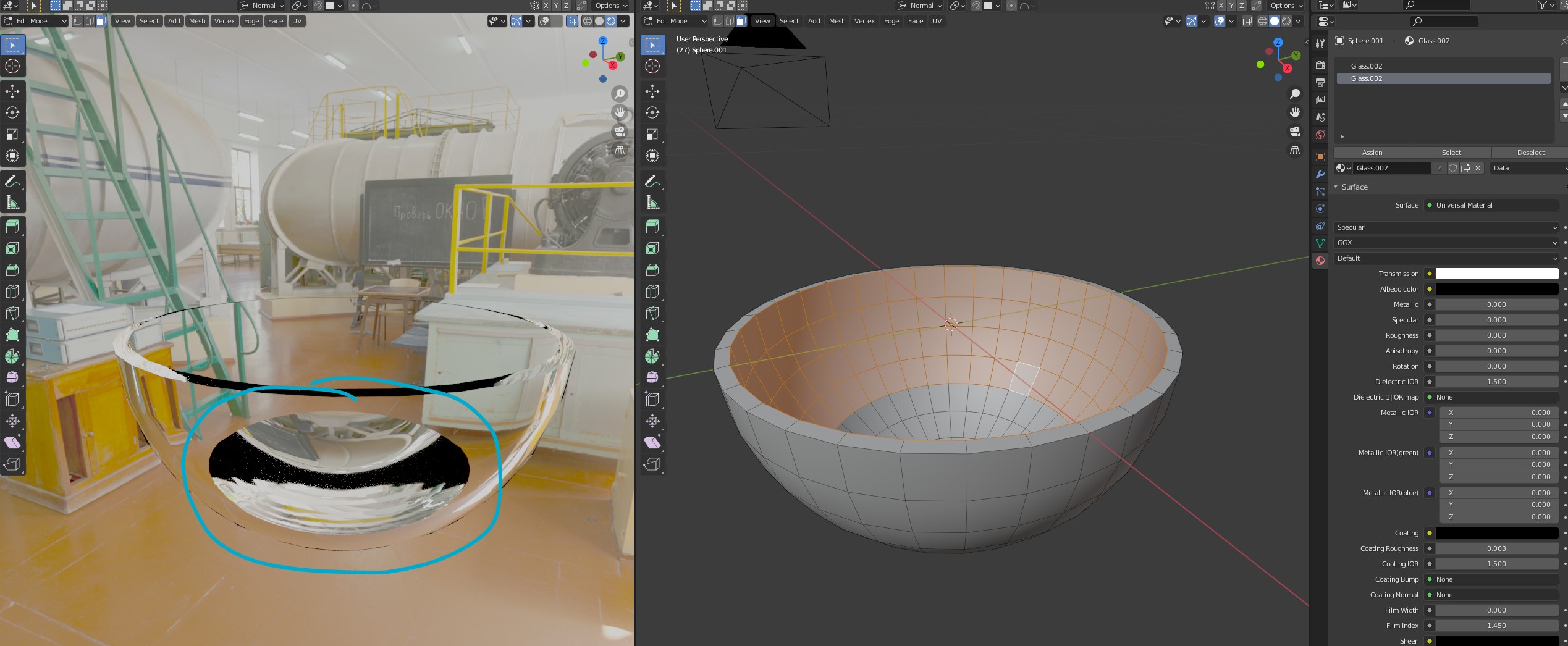 I have a problem assigning two transparent materials to the same object. When I do that, the refractions at the boundary between the two materials are wrong.