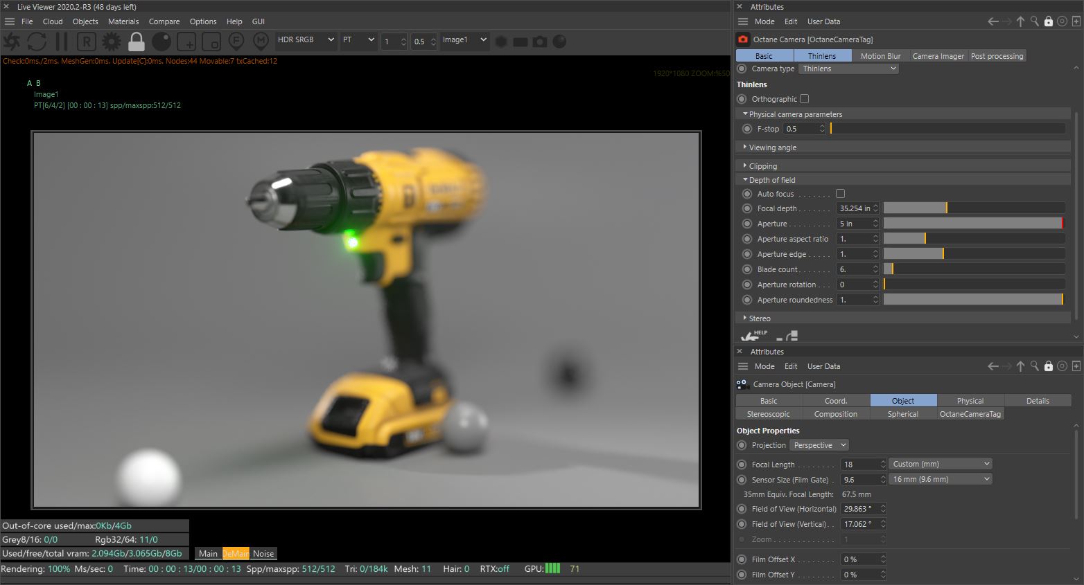 Your setup is ok, but we are talking about something else.twik25 wrote:Unless I am misunderstanding your setup, I don't seem to have issues with dof... Do these look accurate to you? In this example, the White, Gray, and Black Spheres (1.5in Diameter) are each 10in apart.newartstudios wrote:I can make the same scene in real life with real objects with my camera. The distance between objects is like half meter. In real life - those objects will be totally blurred out with Sigma Art 1.8. with 0.5 meter distance from each other. So imagine how it should be with 0.5, but there is no glass in real life to compare. Also I used sensor size and focal length 36mm for octane camera, my camera have super 16 mm with focal length 18mm, with will make no big difference in any case. And ether way if I adjust Octane camera to my cam settings - will not match.