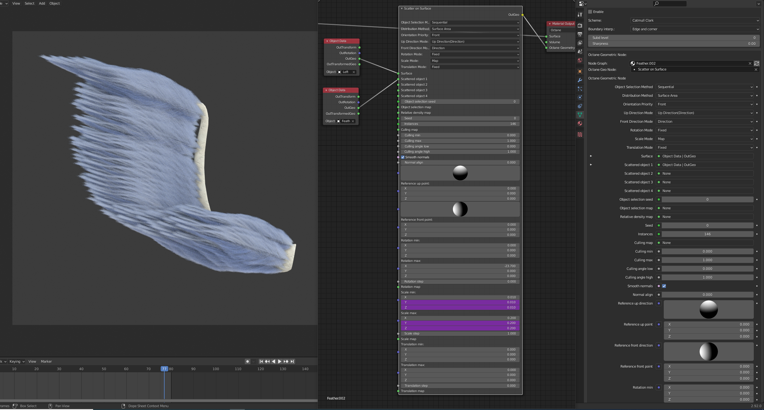 I’m fumbling around with Scatter on Surface trying to get feathers to cascade from large on top to small at the bottom. How can I achieve this? Using Blender’s particle system I can do that via weight painting and vertex groups. How can I do it with Octane’s geometry nodes? I imagine that is controlled somehow by the scale map but everything I try (gradient node, fall off node) effects the size of all the instances together.