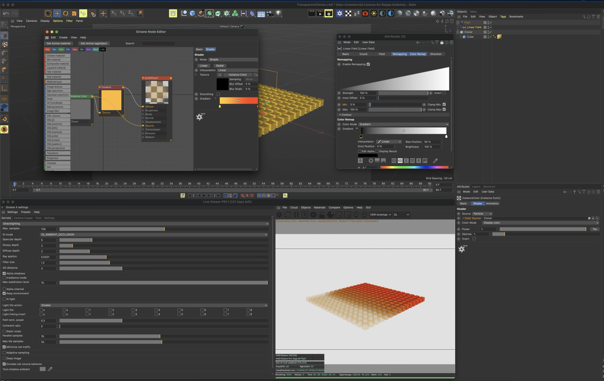 Any workaround on how to make a cloner grid to start from 100% transparency to 0 transparency in Octane? I mean a 3d linear gradient transparency covering the whole cloner. I have seen some workarounds but they're either old or not related to Octane! like this one for example: