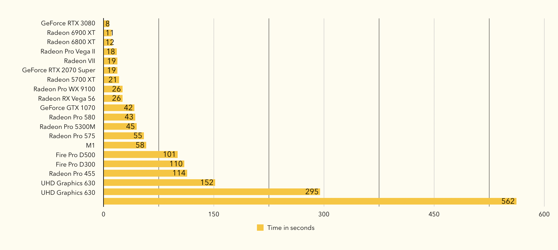 Unfortunately we need to wait for 2021.1 stable SDK, to have an OctaneBench version supporting both CUDA and Metal GPUs, for a precise comparison, but in the meantime, we are trying to have an idea of the speed with this simple test here: