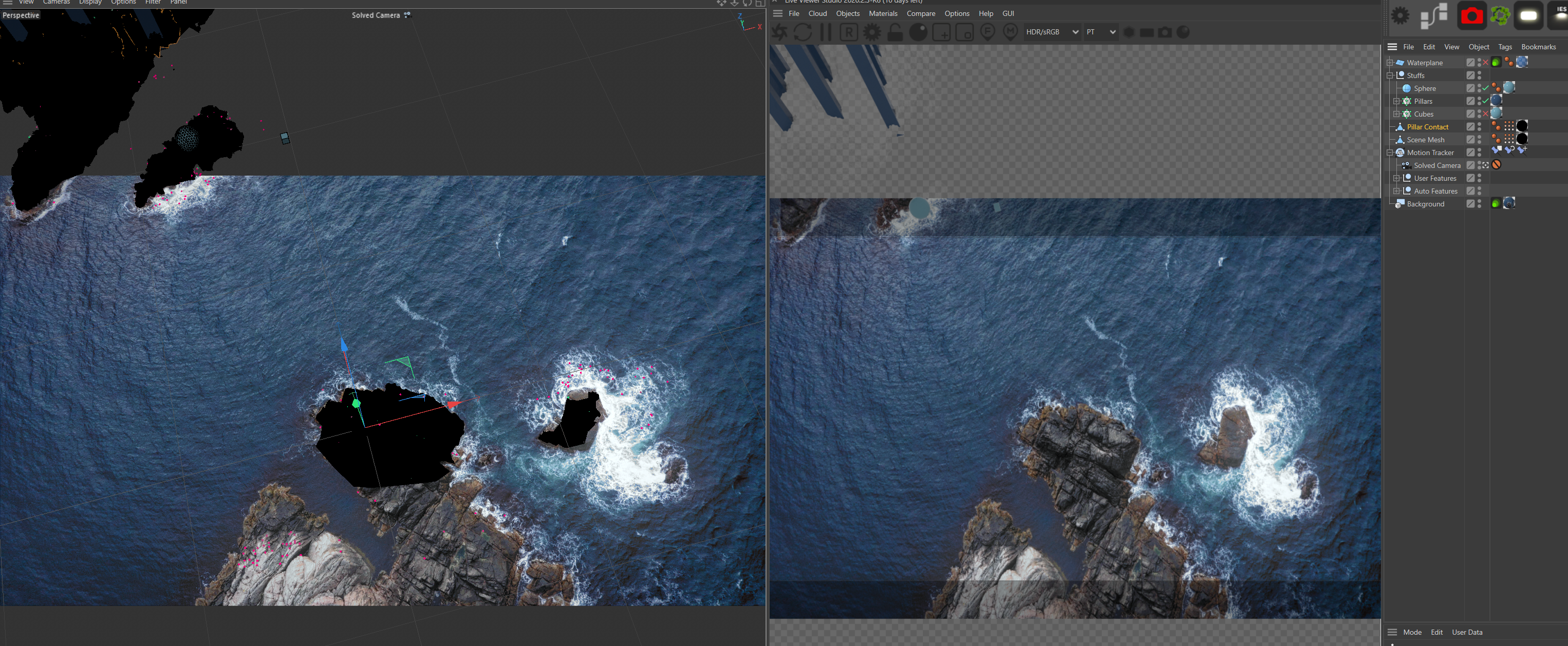 300 frame motion tracked drone shot with TIFF sequence (7GB) in background object with octaneobject tag and some simple meshes.