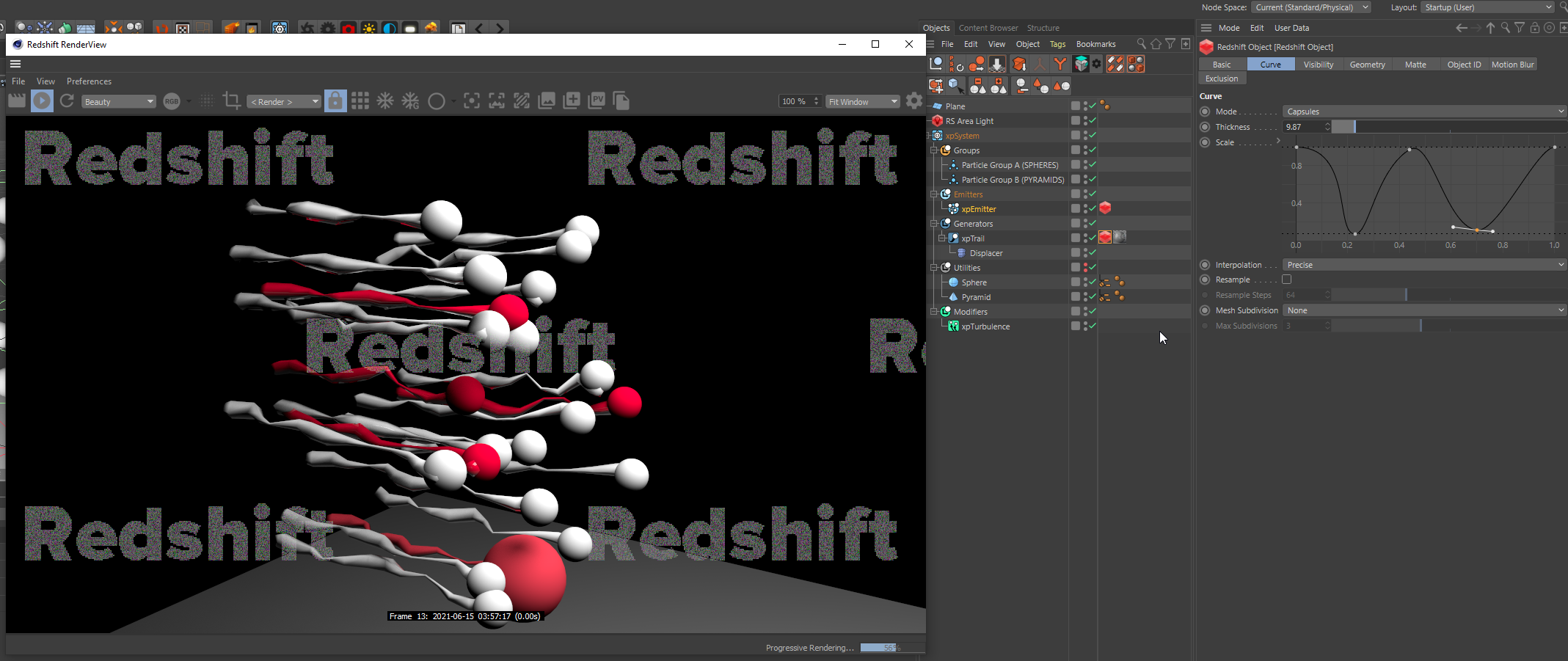 Here is an example of the RS color trail along with a displacer deformer + an xp trail deformer. It also has a profile for the spline + many spline types which is very handy as well and this is also another thing we could use.