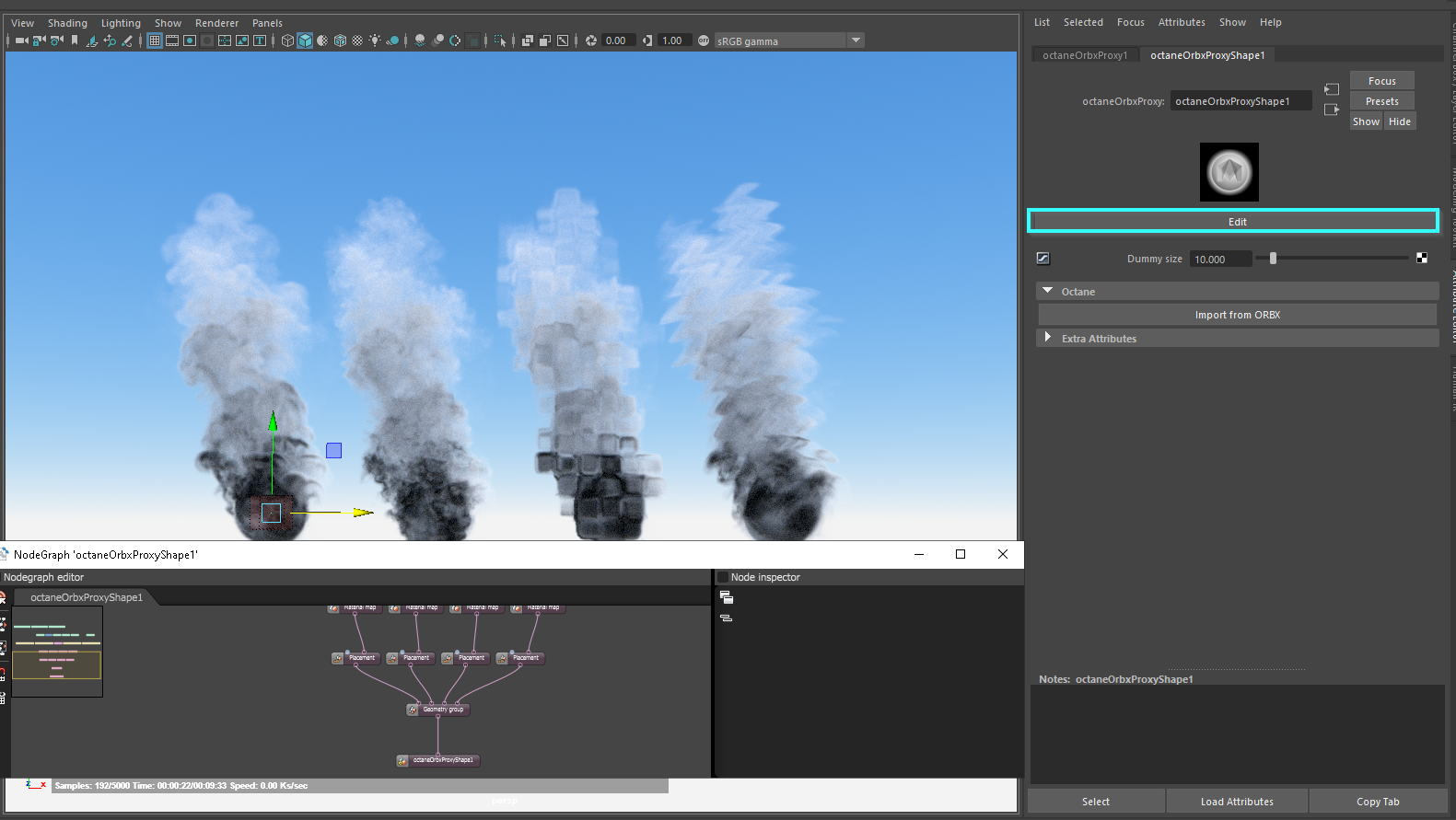 The volume displacement is done using OSL textures pinned into Sample Position Displacement on the Octane Scatter nodes.