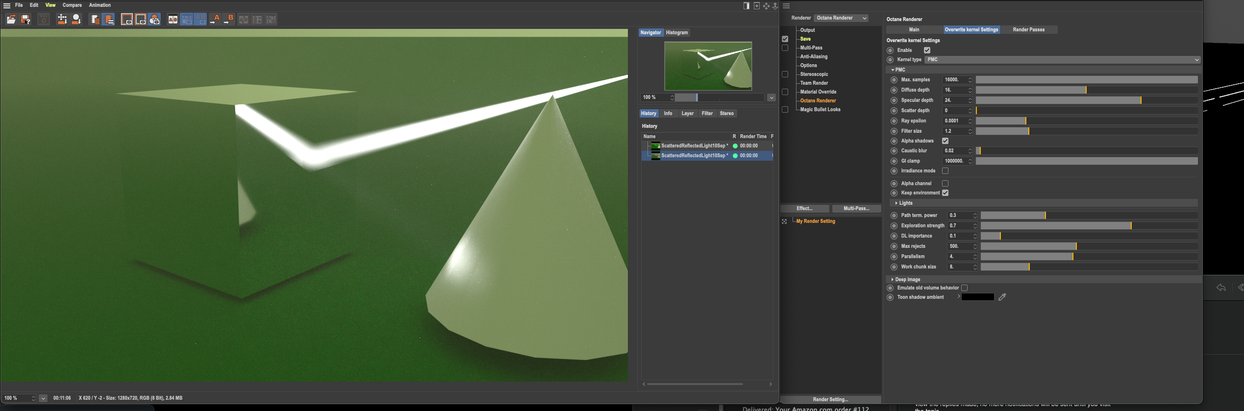 The effect isn't as dramatic as I had hoped. And, as you say, compute intensive. It is hard to see the effect in the attached image but I can see it on my system. Very faint scattering from the cube to the cone.