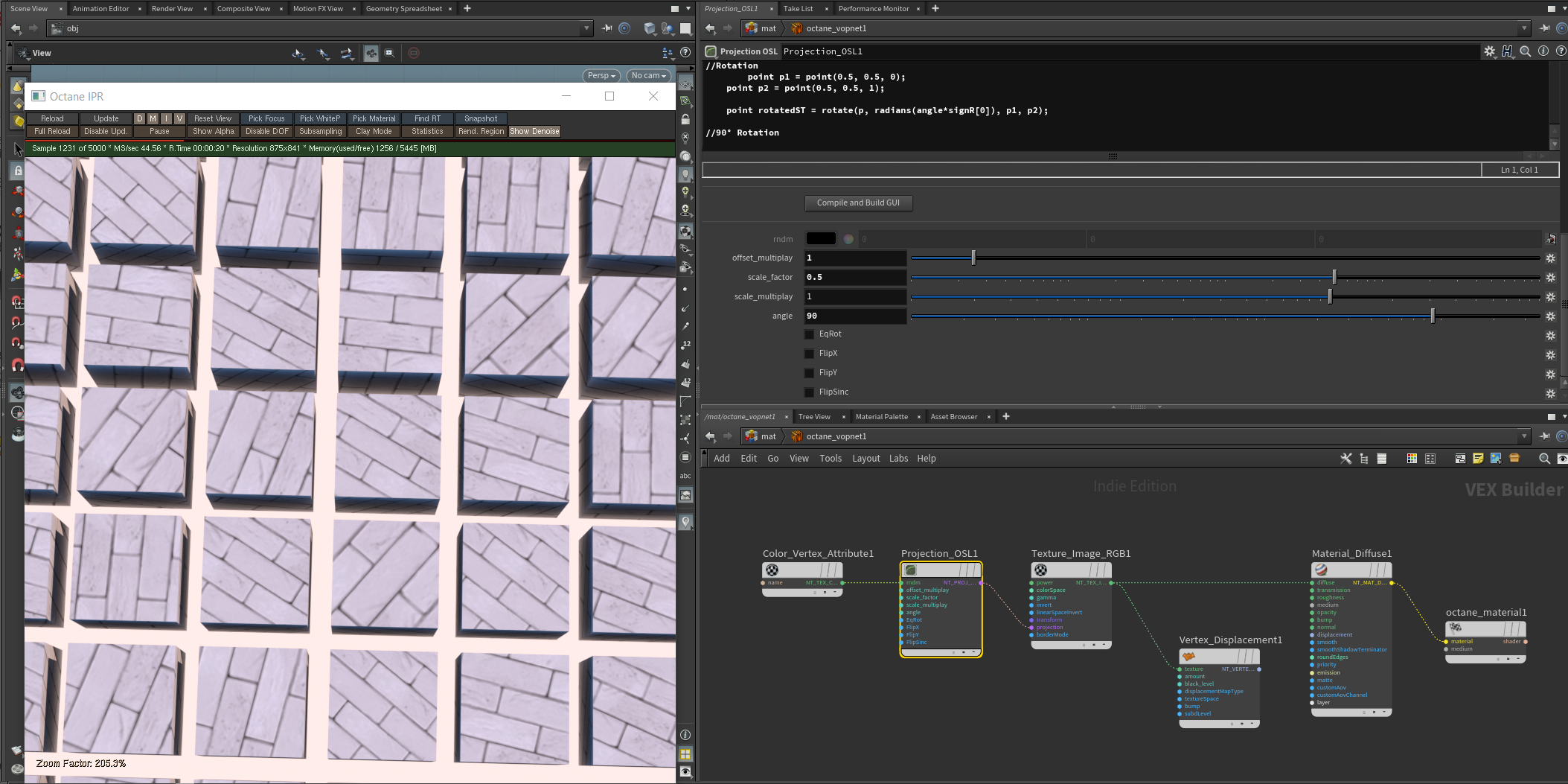 Anyway, even without instancing, I think that this workflow doesn't work with Octane because the displacement nodes don't support the modification of the mesh UV. It works with color or bump maps, but not with displacement. Attached you have an example scene including an OSL node to randomize the UVs, but it doesn't work for displacement