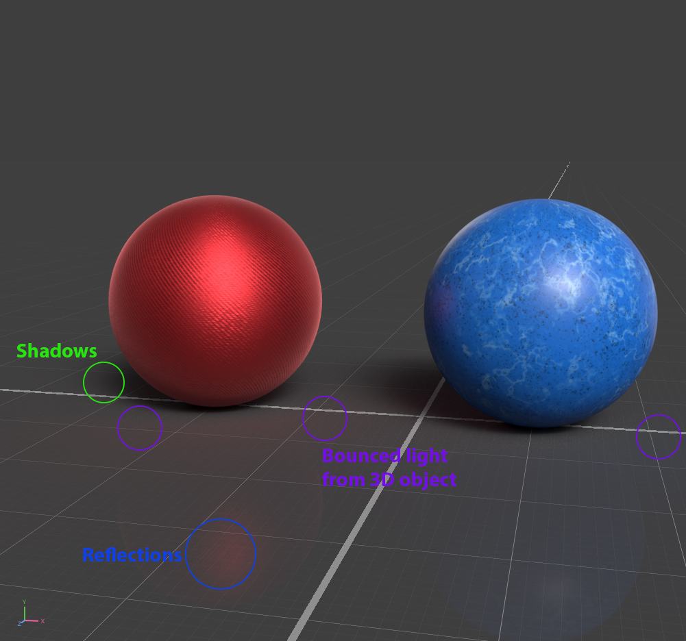 There are shadows, bounced light from the 3d object onto the plane, and reflections.