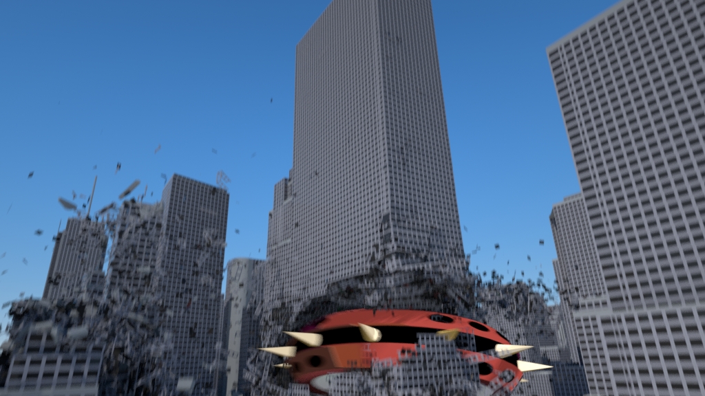 Octane is failed rendering a scene with no textures but zillions of geometry. ( 10 buildings destroyed )