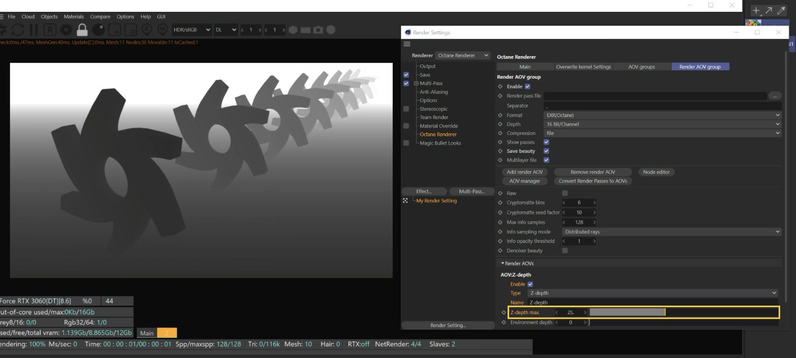 1. Go to Render Settings/OctaneRender/Render AOV Group, activate the Enable checkbox, and press Add render AOV, then info/Z-depth AOV: