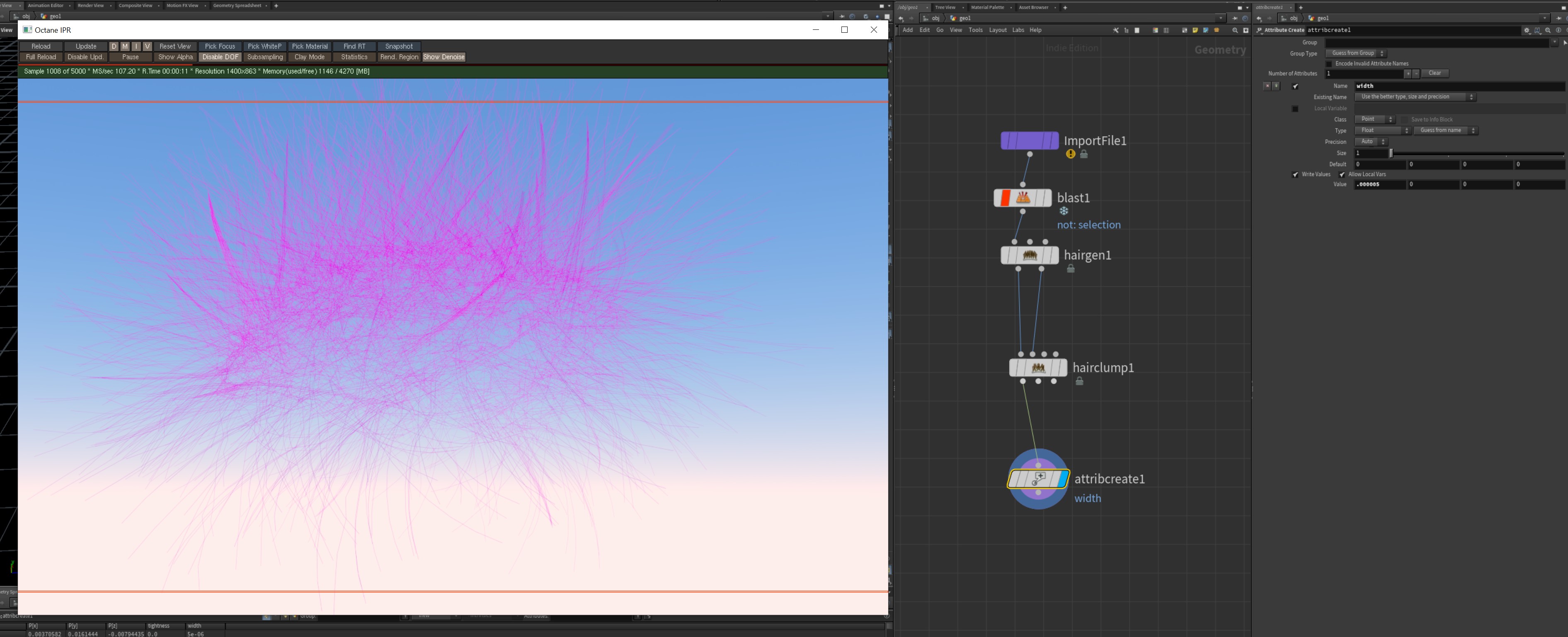 Thanks,galleon27 wrote:Just create a width attribute and set it to whatever you want or just go the the hairgen sop and edit the hair profile. Root and tip thickness in octane obj params does nothing because hairgen creates a width attribute that overrides whatever is in the obj parameters.