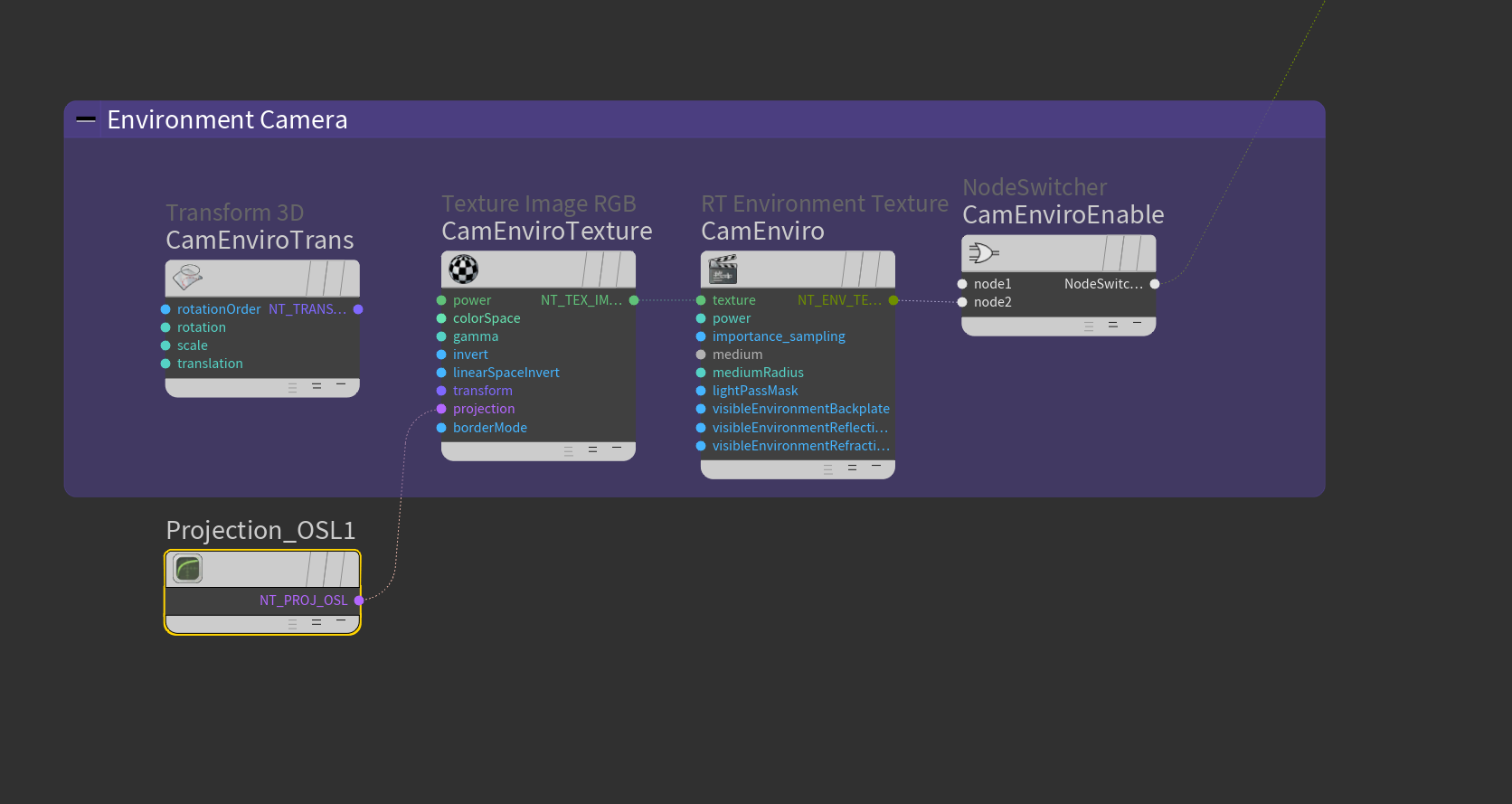 5. Feed all interested Texture Imager nodes trough projection port - in Camera_Environment group for example