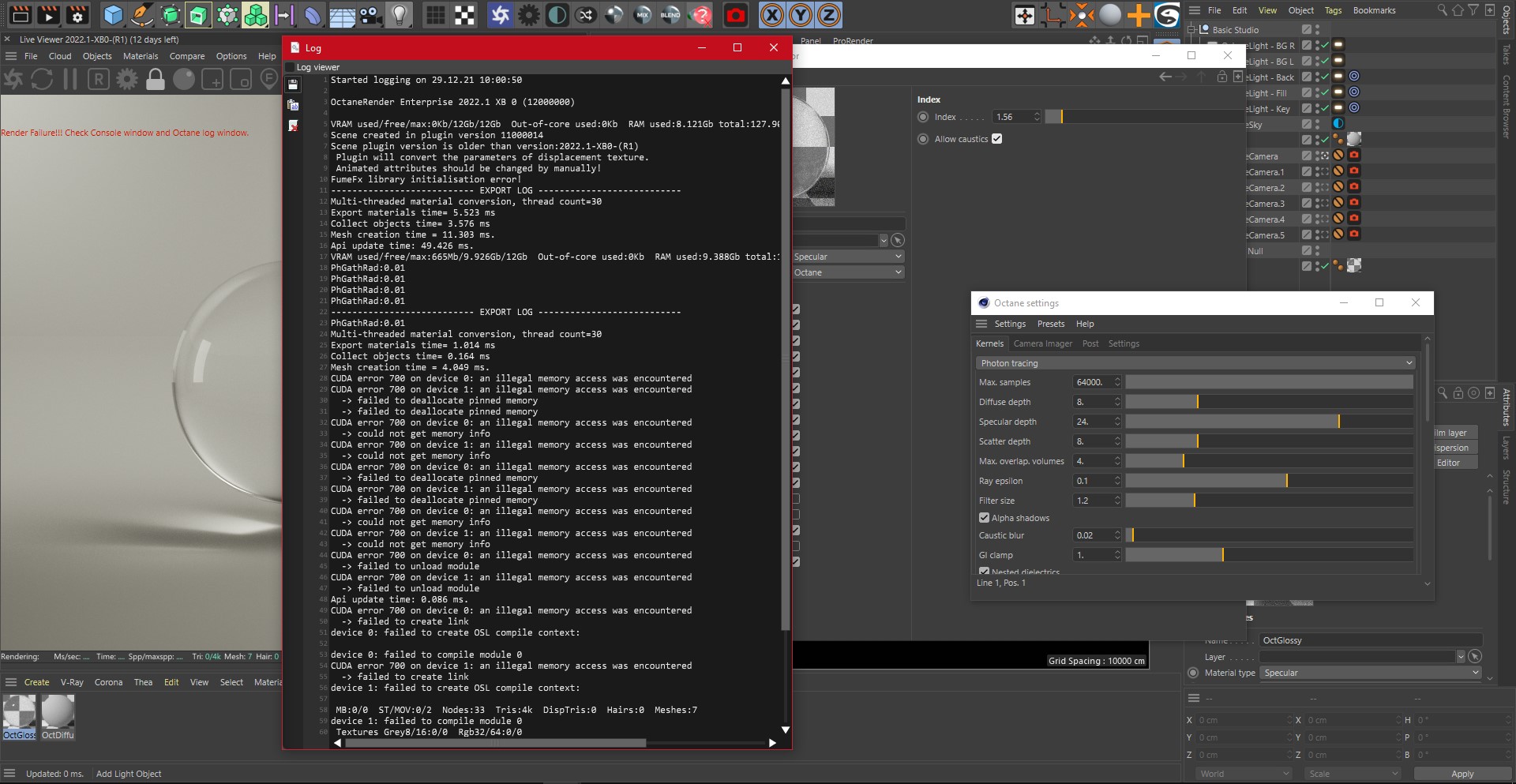 4- Check the free amount of GPU's VRAM and system's RAM while working. Low VRAM will/may cause CUDA errors. Be aware of some generator objects will have different triangle count in Picture Viewer than Live Viewer. It’s like “editor/render” parameter. Just try to use the same value. Also try to optimize your scene for polygon count, even use smaller images. Try to use Octane texture nodes rather than using C4D texture/shaders.