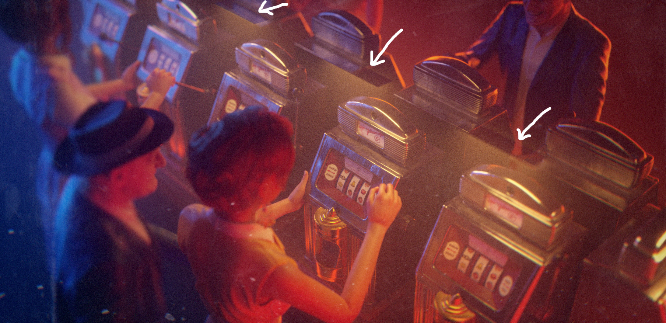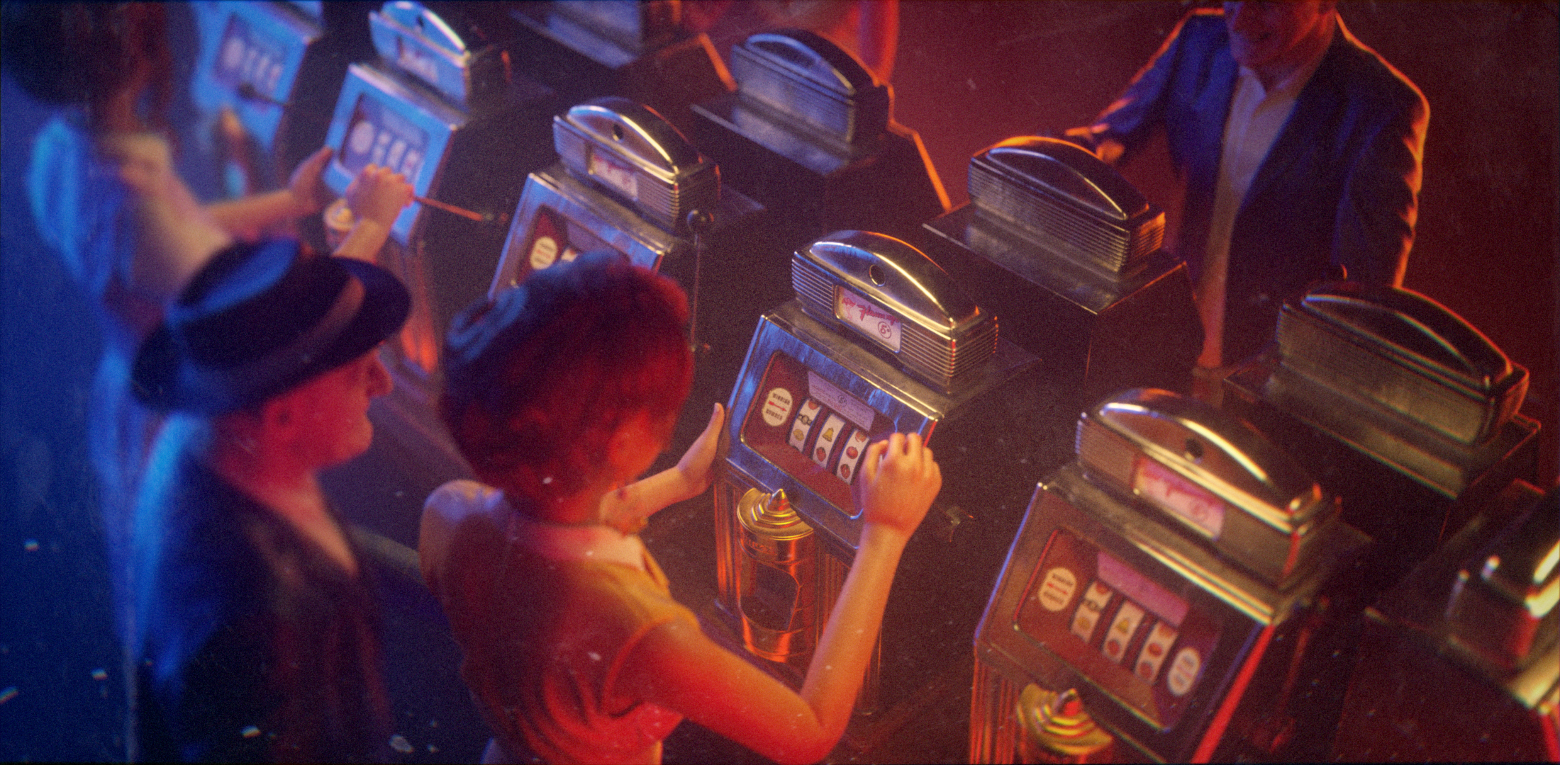 Here's a scene I'm currently working on; I've got the reflections on the front faces of the slot machines looking how I want, but it requires me to put an area light just above each machine. Except they show up in the fog.