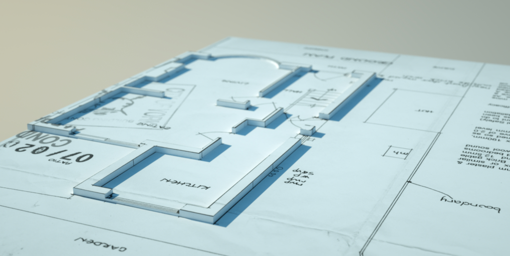 I liked the look of the shape of the walls rising out of the scan of our plans on this quick render.