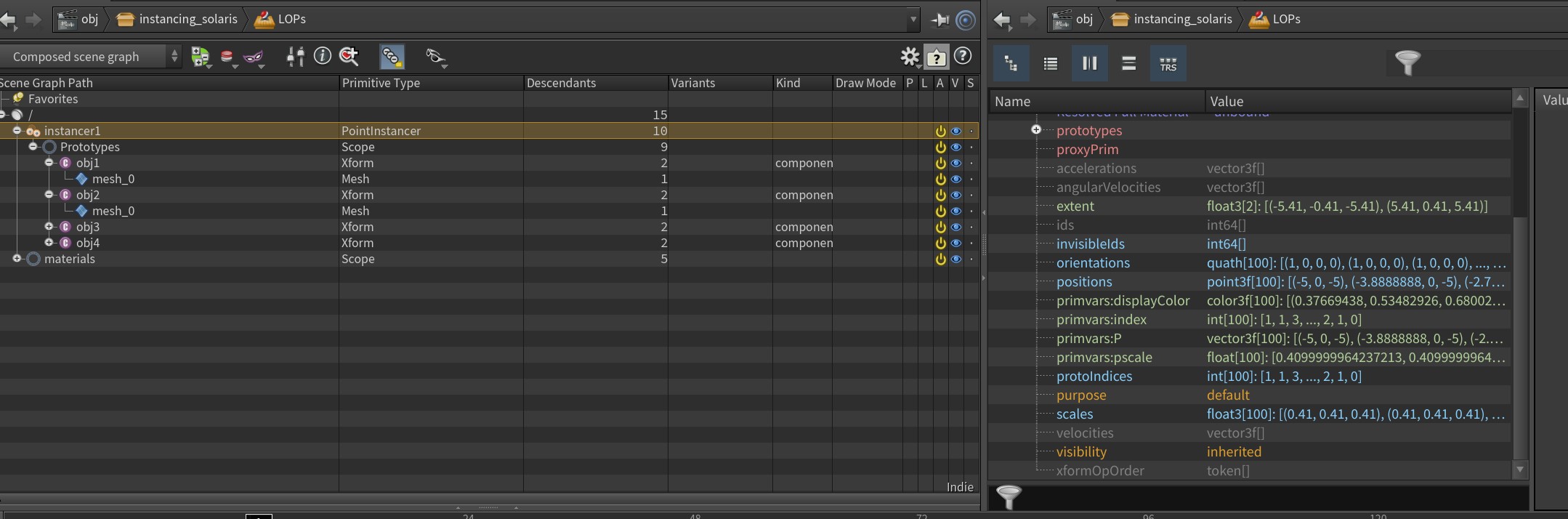 The instancer LOP is set to "Point Instance" method so there is only 1 copy of the source mesh in the scene graph and its instanced onto the points (if you set the method to Reference, it will copy the mesh and apply the attributes, but that isn't instancing).