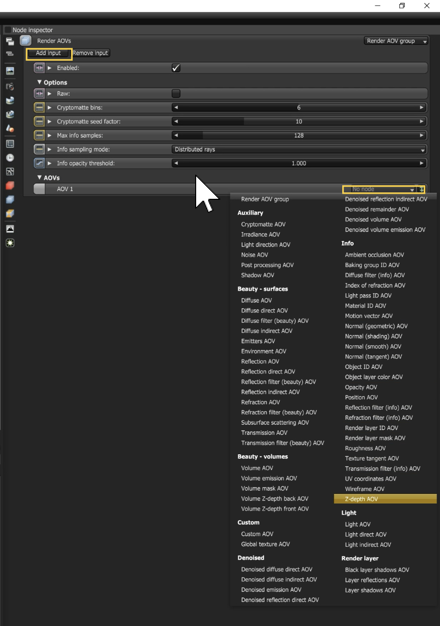 If you have switched from 2020.2.x to 2021.1.x, now the Z-depth pass is under Render AOVs/Render AOV group node, you need to click on the Add input button, then select the desired AOV in the No Node menu: