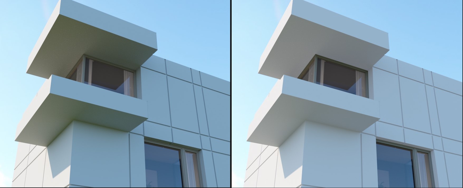 I noticed that Octane has trouble in specific situation with light distribution between polygons that are placed on some large distance like > 5meters. It is much more noticeable on exterior architectural scenarios where skyligh should be bounced from ground and travel up to light surfaces that are not directly exposed to direct light. Under balconies or deeply corners, small tunnels we have light leaking - they are underlighting. Indirect light has problem to reach to these areas on larger distance.