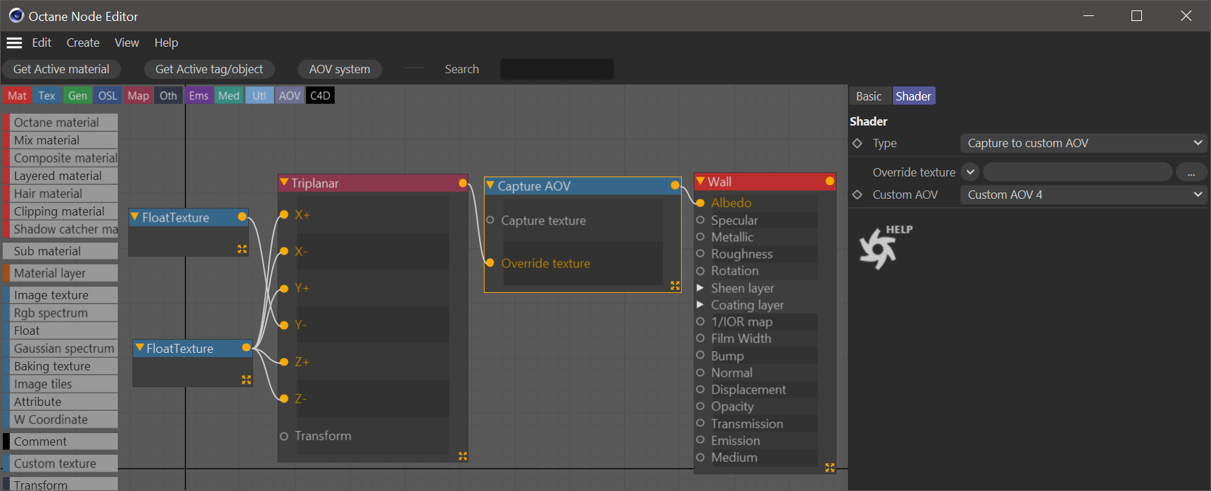 To make this work properly, you need to adjust your Wall material and your AOV flowgraph. The corrected Wall material makes use of the Capture (to Custom Texture) AOV, inserted between the Triplanar node and the Diffuse on the Wall material. It is set to Custom AOV 4, as illustrated below: