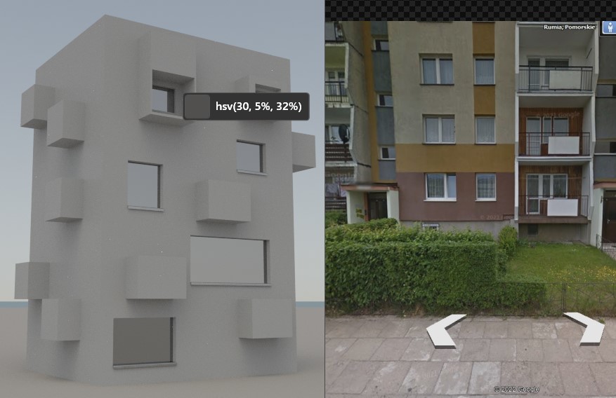 Real photo, ambient, cloudy sky. Balconies obstructed by trees. Pure white even on walls under - impossible to make in Octane :