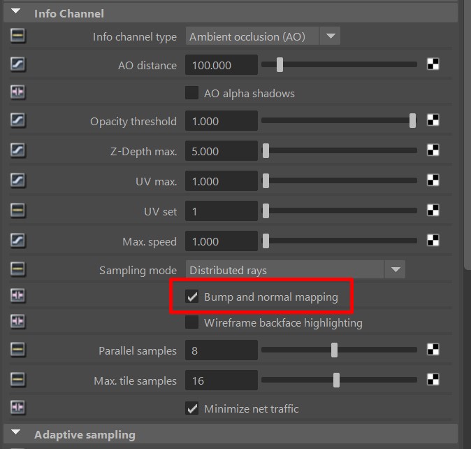 Until then, if you add another AOV that has this option (i.e. shading normals or texture tangent), or just simply the tangent normal AOV, the ambient occlusion AOV will also be rendered with bump/normal mapping.
