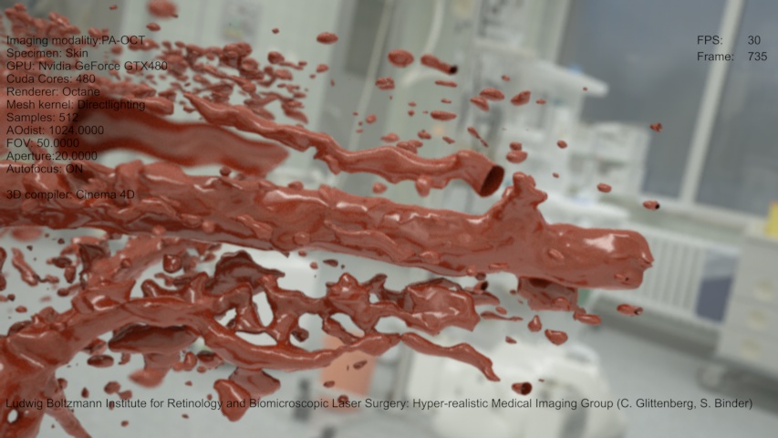This is an example of an optical coherence tomography photo acoustic data set of the blood vessels in mouse skin. Visualized using automatic iso-mesh segmentation and GPU-Physically based rendering. Keep in mind the patient was alive when this was done. The process was automatic. There was no mesh modeling required. This was rendered entirely on a GPU (Nvidea GTX 480) using CUDA technology using Cinema 4D and the Octane Render Plugin.