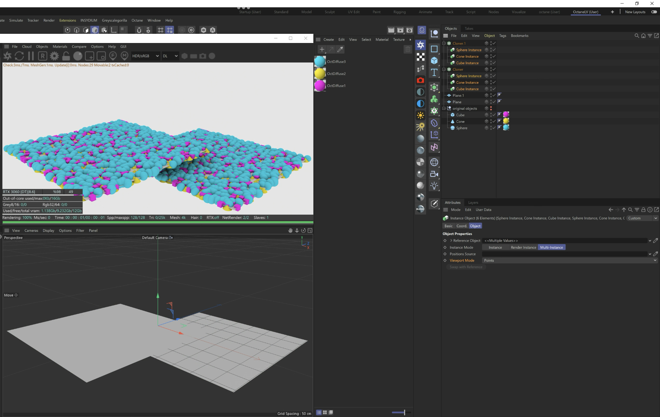 I need to distribute 3 different objects on the surface of the three planes, I made three copies of the three objects and placed them under the subset of the three scatters, it works. But because the three objects are copied three times, the VRAM is occupied three times. How can I use three scatters to distribute these three objects to different objects without duplicating them? Is it possible to use xpresso or scene nodes and how?