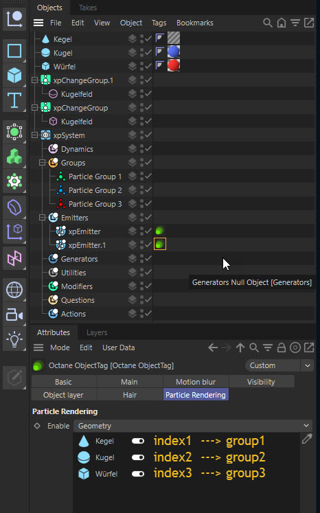 As in the prev example needs a NULL in the octane obj tag. Not sure why something with IDs but it does work proper with one emitter in each group.