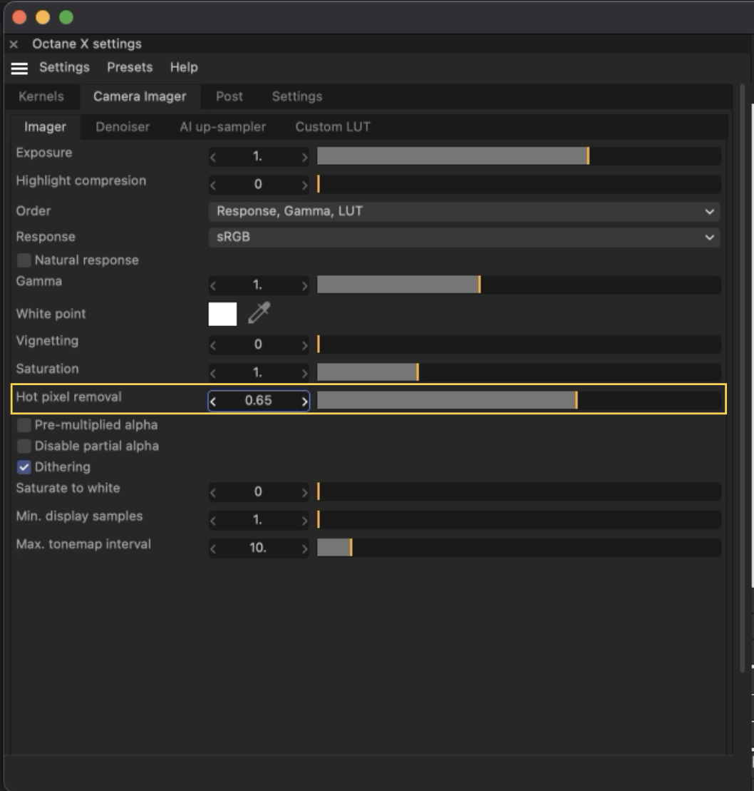 Alternatively, you can try with Hot pixel removal slider in Camera Imager node, but avoid to go under 0.65, and consider that it is distructive, so you can have artifacts. Another option is to try with internal C4D Denoiser in Picture Viewer, but it is not like AI Denoiser: ciao,