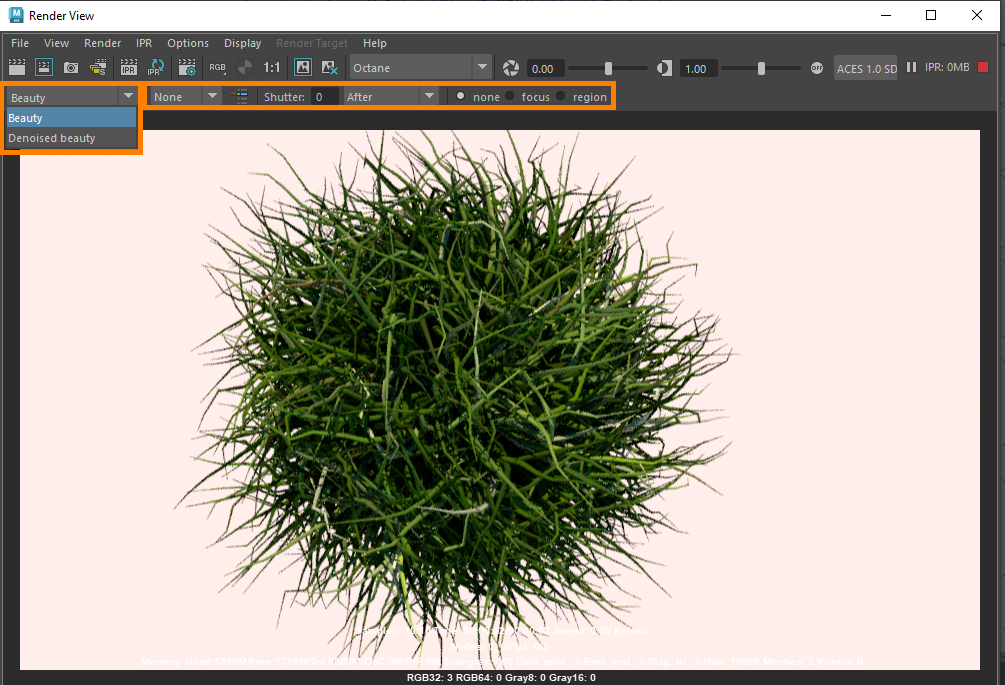Octane subsampling, Render selected, Motion blur setting, Focus, and region render can be accessed from the IPR instead of having the Render settings dialog opened.